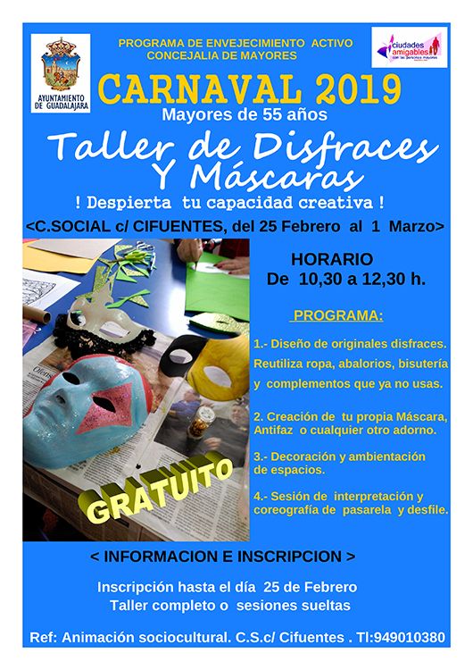 Previo a la celebración del Carnaval, la Concejalía de Mayores del Ayuntamiento de Guadalajara organiza dos talleres para que el colectivo de mayores de 55 años pueda participar de forma activa y creativa en las tradicionales fiestas de Carnaval.