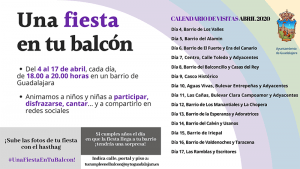 El Ayuntamiento de Guadalajara, a través de la Concejalía de Infancia, ha creado una nueva iniciativa con el propósito de animar a los más pequeños de Guadalajara. El objetivo de esta propuesta, denominada Una Fiesta en tu balcón, según la concejala de Infancia, Sara Simón, es que “también los niños y niñas, que son parte de la población que está confinada, puedan tener su propio momento de ocio a través de la música y la diversión compartida con vecinos de su edad aunque sea desde sus ventanas o balcones, disfrazarse, cantar o, simplemente, disfrutar a su manera”.