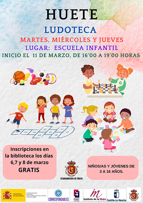 El Ayuntamiento de Huete pone en marcha la ludoteca en horario de tardesEl Ayuntamiento de Huete pone en marcha, un año más, la ludoteca en horario de tardes para cuidados de niños/as de 0 a 16 años con el fin de prestar un servicio de conciliación familiar, laboral y personal, patrocinado por el Plan Corresponsables.