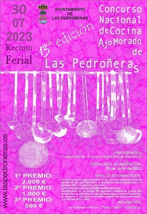 El alcalde de Las Pedroñeras, José Manuel Tortosa, señala que el XIII Concurso Nacional de Cocina Ajo Morado de Las Pedroñeras despierta gran interés entre los profesionales y prueba de ello es que “cada año es más difícil elegir a los que estarán en la final”. Respecto a los premios, se establece un “primero de 2.000 euros, un segundo que alcanza los 1.000 euros y un tercero que tendrá una dotación económica de 500 euros”. Hasta el momento se han llevado a cabo doce ediciones con los siguientes ganadores: Alberto Vicente Alba (2009), Chema Soler (2010), Federico Guajardo (2011 y 2013), Antonio Arrabal (2012), Oscar Rodríguez (2014), Daniel García (2015), Álvaro Abad (2016), Javier Ramos (2017), Ramces González (2018), José Francisco Atienza (2019), y Antonio González (2022).