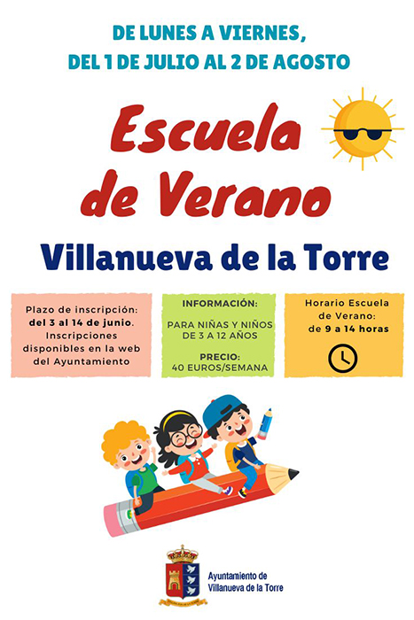 El Ayuntamiento de Villanueva de la Torre va a facilitar un año más la conciliación de las familias del municipio con la puesta en marcha de su Escuela de Verano infantil, dirigida a niños y niñas de 3 a 12 años.
