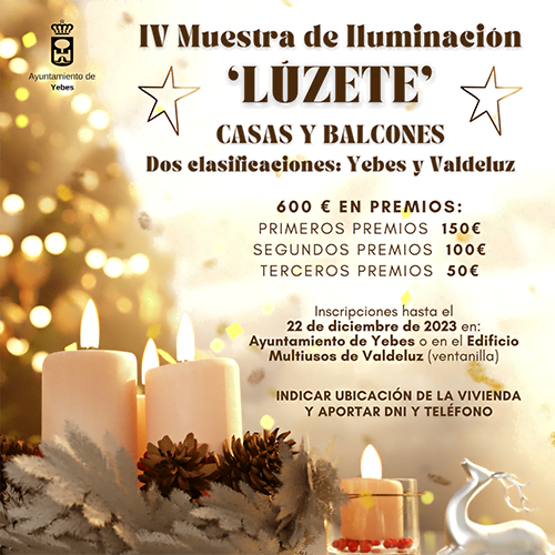 Con ‘Lúzete’, el Ayuntamiento de Yebes busca estimular la alegría festiva de esta Navidad, así como fomentar la creatividad y la inventiva de todos los residentes, haciendo que Yebes y Valdeluz brillen con todo su esplendor y convirtiendo sus calles en un verdadero espectáculo luminoso que eleve el ánimo de todos durante estas fiestas.Principio del formulario
