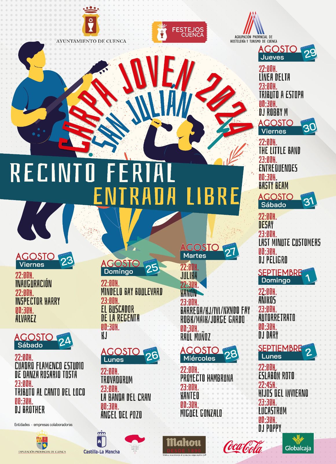 WhatsApp Image 2024 08 20 at 17.58.16Para esa feria de San Julián, junto con el Ayuntamiento de Cuenca y su concejalía de Festejos, ha programado once días de directos en la carpa situada junto a bomberos, concretamente del 23 de agosto al 2 de diciembre, coincidiendo con la actividad del ferial.