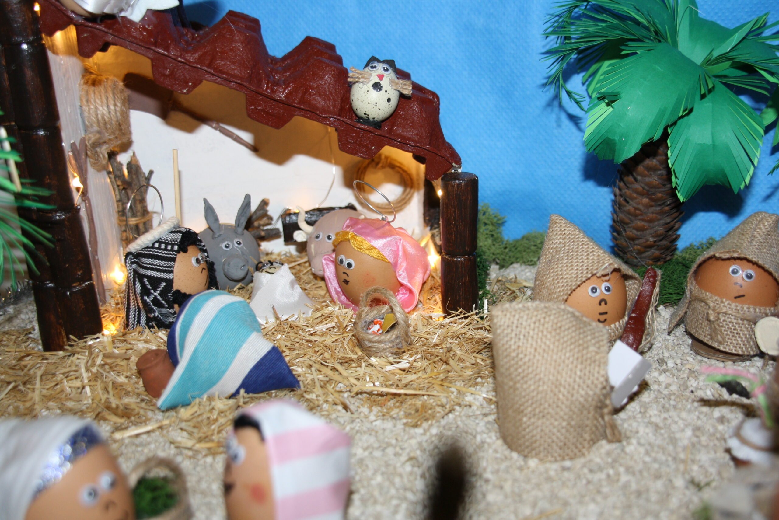 La creatividad y laboriosidad del belén realizado con cáscaras de huevo, instalado en la entrada principal del CECU, han sido las dos características que ha valorado el jurado en el primer premio de los belenes. Un portal con las escalas adecuadas en figuras y construcciones y con un guiño a los más pequeños que tenían que buscar a “Wally”.