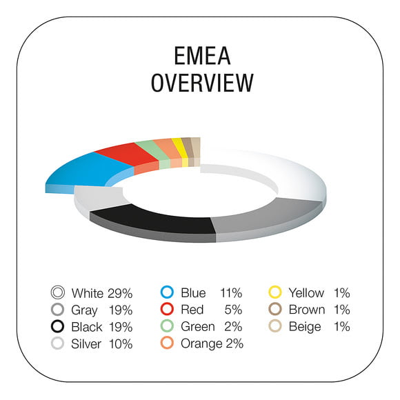 Europa, Medio Oriente y África (EMEA) registraron aumentos en sus dos colores más populares: blanco y negro, y pérdidas de cuota de mercado para el gris y el plateado. Al mismo tiempo, la región se volvió mucho más colorida.