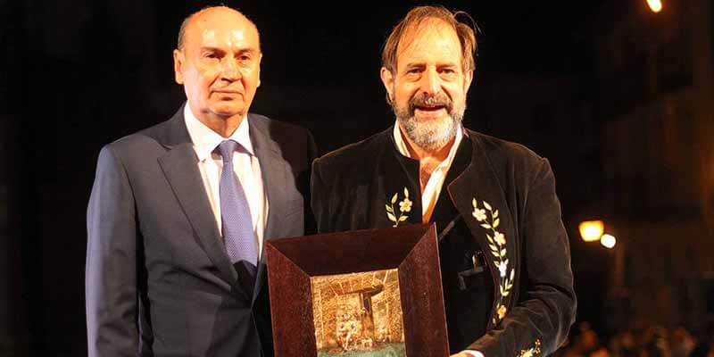 Poco a poco, el pregonero se vino arriba, dejando sentencias sobre el estrado como que “la familia, los oficios antiguos, las fiestas y las aficiones son igual a la felicidad”. Blasco se acordó también de las madres y de las mujeres en general, “que nos han traído a la fiesta de la vida”, reivindicando en varios momentos de su discurso la igualdad de género y censurando vehementemente la violencia machista. Naturalmente, y como no podía ser de otra manera, interpretó dos piezas, con flauta y dulzaina, respectivamente, una de Bob Dylan, ‘Los tiempos van cambiando’, y la muy popular en la ciudad, ‘La ovejita lucera’, en la que le acompañó como redoblante el joven Alberto Sopeña. Blasco recibió un hermoso cuadro del cincelador Mariano Canfrán como distinción por haber sido pregonero de las fiestas de San Roque 2017.