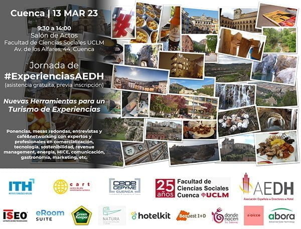 Profesionales del sector hostelero en sus múltiples dimensiones, desde la dirección o la gerencia al marketing y la comunicación, participarán el próximo lunes, 13 de marzo, en la jornada “Nuevas herramientas para un Turismo de Experiencias”, que acogerá y organiza la Facultad de Ciencias Sociales de Cuenca, en colaboración con la Asociación Española de Directores y Directivos de Hotel (AEDH).
