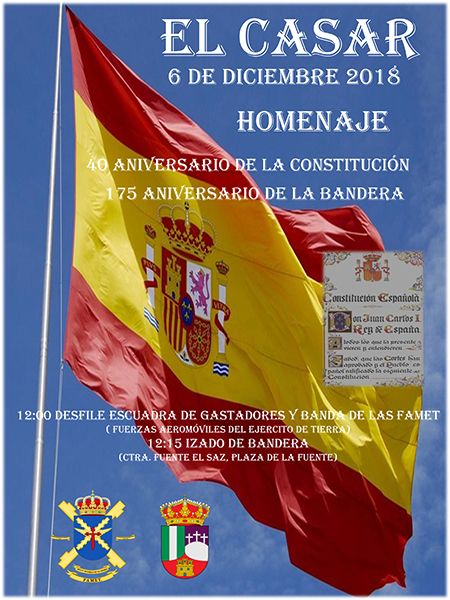 Con motivo del 40 aniversario de la Constitución Española y del 175 aniversario de la Bandera, desde el Ayuntamiento de El Casar se ha organizado para el próximo jueves, día 6 de diciembre, un acto institucional de homenaje a los símbolos más importantes de España.