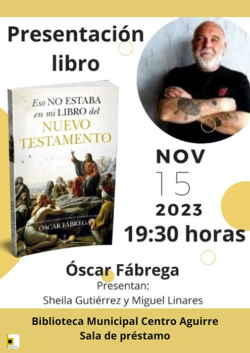 El Centro Cultural Aguirre acoge la presentación del libro Eso no estaba en mi libro del Nuevo Testamento, de Óscar FábregaEl miércoles 15 de noviembre se presenta en la Biblioteca Municipal del Centro Aguirre el libro Eso no estaba en mi libro del Nuevo Testamento, de Óscar Fábrega.