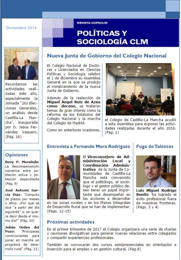 De igual manera la revista pretende dar a conocer a diversos politóg@s y sociolog@s de Castilla- La Mancha, que desempeñan labores de interes en la región y en Iberoamerica. En esta ocasión Revista CCPSCLM, cuenta con dos extraordinarias entrevista a Luis Miguel Rodrigo, tomellosero y Profesor en la Universidad Católica de Chile, y de don Fernando Mora, Viceconsejero viceconsejero de Administración Local y Cooperación Administrativa en la JCCM.