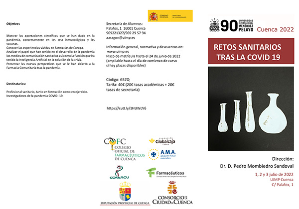 El Colegio Oficial de Farmacéuticos de Cuenca ha organizado un curso en colaboración con la Universidad Internacional Menéndez Pelayo, UIMP, titulado “RETOS SANITARIOS TRAS LA COVID-19”. En el mismo participarán los mejores profesionales dentro de cada área de conocimiento relevante durante la pandemia: científicos del CSIC que lideran equipos de trabajo en diseño de vacunas, en sistemas de detección o en vigilancia genómica, entre otros. Así mismo también participarán otros investigadores de diferentes ramas de conocimiento y expertos más mediáticos que han desarrollado una gran labor durante la pandemia, bien sea analizando datos u ofreciendo información veraz a la población.