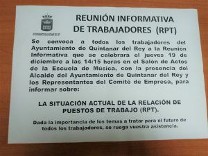 El comité de empresa del Ayuntamiento de Quintanar del Rey ha emitido esta mañana un comunicado, suscrito por ocho de sus nueve miembros, en el que se desmarca de la convocatoria anónima que están recibiendo por wasap los trabajadores municipales para que acudan este mediodía a una “reunión informativa sobre la situación actual de la Relación de Puestos de Trabajo” que presuntamente contará “con la presencia del Alcalde” y de “los representantes del Comité de Empresa”