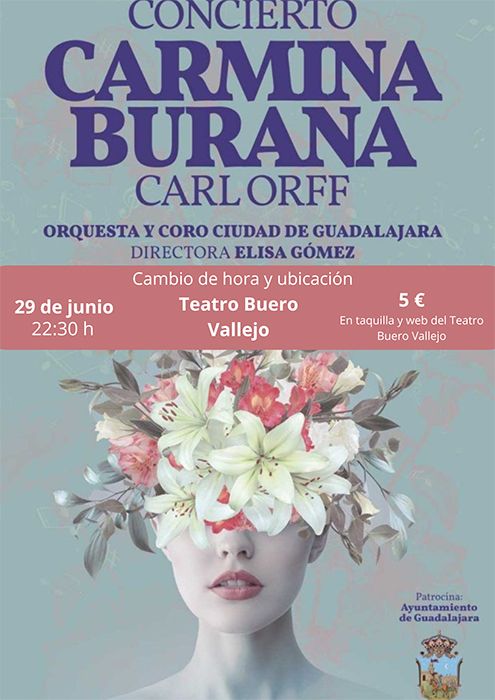 Debido a la alta probabilidad de tormentas que se anuncian en las previsiones meteorológicas del próximo sábado 29 de junio, el concierto de Carmina Burana de Carl Orff, interpretado por la Orquesta y Coro ‘Ciudad de Guadalajara’, se celebrará en el Teatro Buero Vallejo, en lugar de realizarse en el Palacio del Infantado como estaba previsto