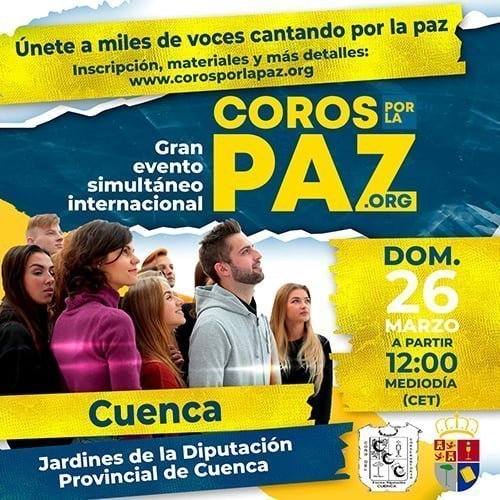 Tras la invasión de Rusia a Ucrania el pasado año, en el mundo se ha removido la conciencia por la Paz y, de una manera espontánea, tras la llamada hecha por la Familia Coral Santiago Apóstol de Griñón (Madrid), 25.000 voces de 1.000 coros de todo el mundo se congregaron en ciudades de España, Portugal y 8 países más para interpretar el canon tradicional «Dona Nobis Pacem»:Este próximo domingo, día 26 de marzo, a las 12h de la mañana en los Jardines de Diputación Provincial, que da su apoyo a esta iniciativa, el Coro del Conservatorio de Cuenca, sede de la organización Coros por la Paz en nuestra ciudad, congregará a otros coros y agrupaciones musicales de Cuenca bajo la dirección de su director, Jesús Mercado Martínez, para unirnos todos y expresar ante el mundo nuestro deseo de Paz, no sólo en Ucrania, sino en el mundo entero.