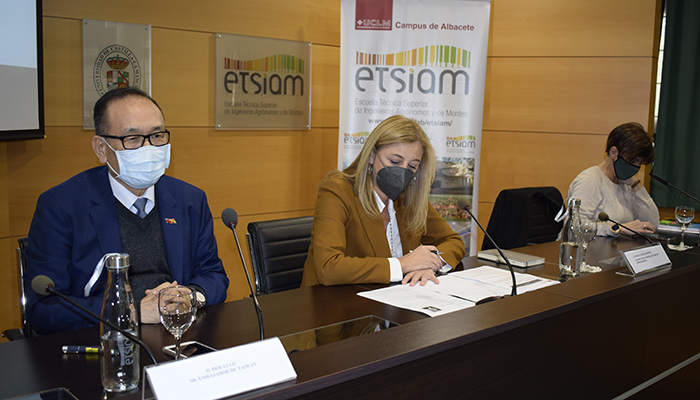 La Escuela Técnica Superior de Ingenieros Agrónomos y de Montes (ETSIAM) de Albacete ha acogido la conferencia que ha impartido el embajador de Taiwán en España, José María Liu (Der-li Liu), en la que ha visibilizado y profundizado sobre su país entre la comunidad universitaria. Durante su visita al Campus de Albacete ha estado acompañado por la vicerrectora de Innovación, Empleo y Emprendimiento, Ángela González; y la directora de la ETSIAM, Ana Josefa Soler, entre otros representantes académicos.