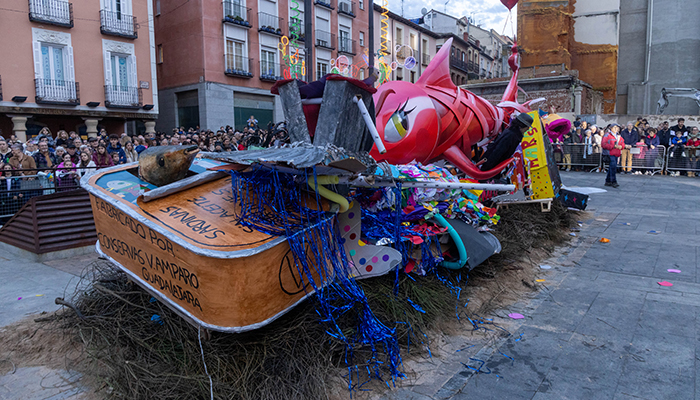 La majestuosa sardina se salva este año de la quema, aunque presidirá este desfile, donde participan diferentes colegios de la ciudad, así como el posterior Combate entre Don Carnal y Doña Cuaresma.