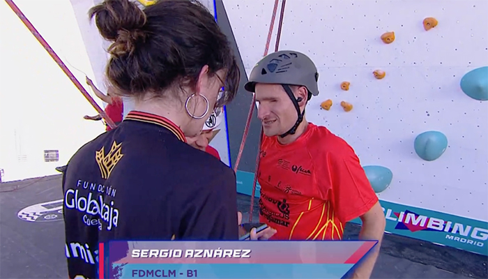 La prueba solo está adaptada a personas con discapacidad física, por eso Sergio ha competido en categoría B1, ciego total, es decir, que esta Federación no tiene en cuenta en el caso que tenga TEA. Tras competir a primera hora de esta jornada, Sergio se ha clasificado para la final, en la que ha sido el único de su categoría. En estas primeras subidas, según explica su entrenadora Paloma Picher, “ha escalado lo que se esperaba: en la primera vía 20 presas y en la segunda vía 14 presas. En cuanto a altura han sido unos 7 metros”.