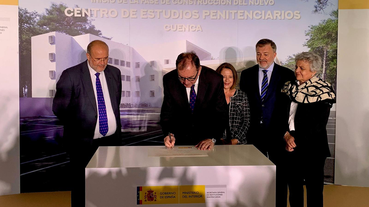 El secretario general de Instituciones Penitencias, Ángel Luis Ortiz, junto con la subdelegada del Gobierno en Cuenca, Mª Luz Fernández, y la presidenta de SIEPSE, Sofía Hernanz, ha visitado hoy el inicio de las obras de construcción del futuro Centro de Estudios Penitenciarios en la ciudad conquense.