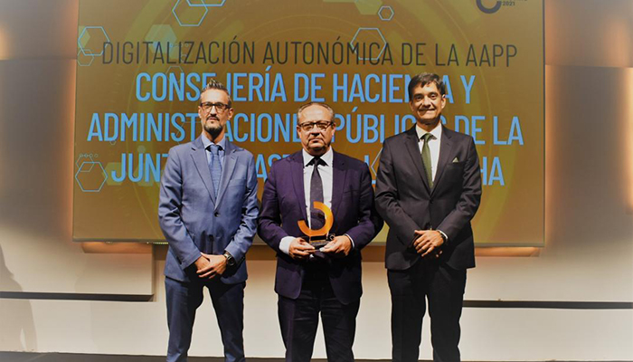 El consejero de Hacienda y Administraciones Públicas, Juan Alfonso Ruiz Molina, ha recogido el galardón, otorgado a la Junta de Comunidades de Castilla-La Mancha en la categoría de ‘Digitalización autonómica de la Administración Pública’, de manos del presidente de HPE para España, Portugal, Italia, Grecia e Israel, José María de la Torre, empresa que participa en el Centro Regional de Innovación Digital con tres iniciativas tecnológicas ligadas a la formación, el fomento del empleo y la digitalización de la pyme.