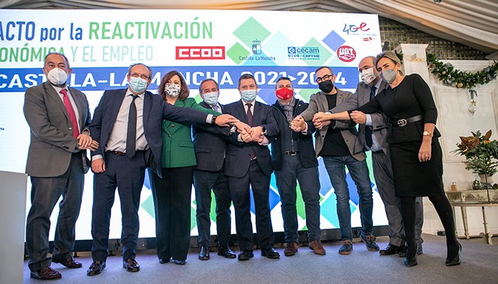 El Gobierno de Castilla-La Mancha subraya la ambición del nuevo Pacto por la Reactivación Económica y el Empleo, que duplica sus medidasEl presidente regional, Emiliano García-Page, ha firmado hoy el nuevo Pacto por la Reactivación Económica y el Empleo de Castilla-La Mancha con los responsables regionales de CCOO y UGT, Paco de la Rosa y Luis Manuel Monforte, respectivamente; y el presidente de CECAM, Ángel Nicolás; en presencia del vicepresidente de Castilla-La Mancha, José Luis Martínez Guijarro; la consejera de Economía, Empresas y Empleo, Patricia Franco; y el consejero de Hacienda, Juan Alfonso Molina; además de un centenar de representantes de colectivos y asociaciones participantes en el Pacto.