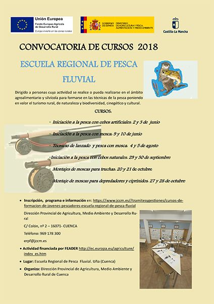 La Dirección Provincial de Agricultura, Medio Ambiente y Desarrollo Rural de Cuenca oferta seis cursos de pesca fluvial gratuitos que se desarrollarán entre los meses de junio y octubre de 2018 en la Escuela Regional de Pesca Fluvial ubicada en Uña (Cuenca).