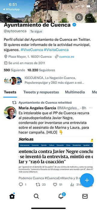 En concreto, desde la cuenta oficial del consistorio conquense, han retuiteado un hilo de la Concejal de Cuenca en Marcha y miembro de Podemos, Mª Ángeles García, que contenía una mención explícita al Partido Popular de Cuenca y en la que la edil morada, critica que la candidata popular a la Alcaldía de Cuenca haya concedido una entrevista a un medio de comunicación que no es de su agrado.