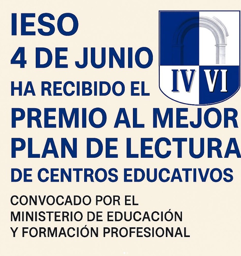 El segundo premio ha llegado de la mano del Ministerio de Educación y Formación Profesional, quien ha distinguido al IESO “4 de Junio” con el Premio Nacional al Mejor Plan de Lectura de centros educativos. Esta mención reconoce la trayectoria del centro en el diseño e implementación de actividades que fomentan el hábito lector, promueven la creatividad y acercan la lectura al alumnado desde diferentes perspectivas. El galardón conlleva una cuantía económica que se invertirá en mejorar la biblioteca escolar y ampliar las actividades del Plan de Lectura. (https://www.educacionfpydeportes.gob.es/servicios-al-ciudadano/catalogo/general/29/2928143/ficha/2928143-2025.html)