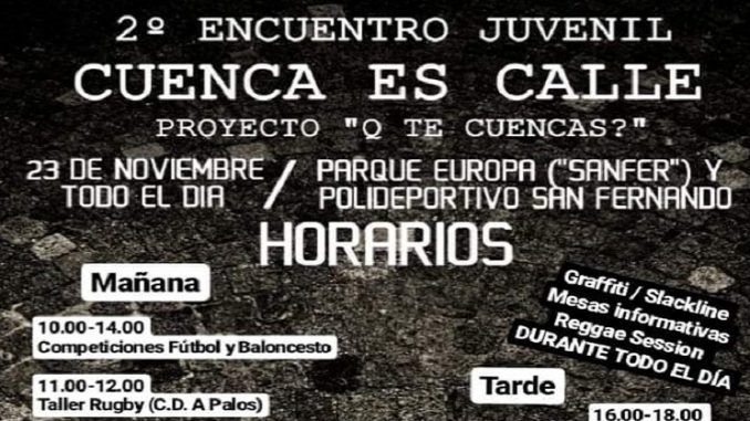 El Ayuntamiento de Cuenca -a través del Área de Intervención Social (AIS) y gestionado por la Asociación Zuclería y el equipo de Educadores y Educadoras de Calle-, realiza este sábado 23 de noviembre el II Encuentro Juvenil ‘Cuenca es Calle’. Se trata de un espacio para jóvenes en el que se ofrecen alternativas de ocio saludable llevadas a cabo por colectivos juveniles y supone una oportunidad para recoger sus propuestas y establecer redes de conexión entre los jóvenes.