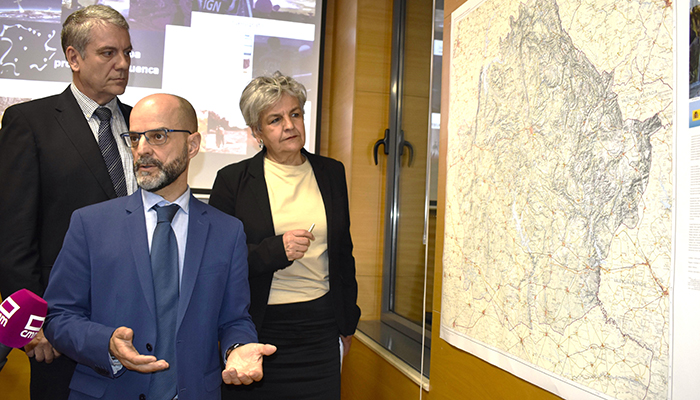 La subdelegada del Gobierno de España en Cuenca, M.ª Luz Fernández, junto al director regional del Instituto Geográfico Nacional (IGN) en Castilla-La Mancha, Juan José Peces, y el director del área de Fomento en Castilla-La Mancha, Rafael Pérez de Ágreda, han presentado esta mañana la actualización del nuevo mapa provincial de Cuenca.