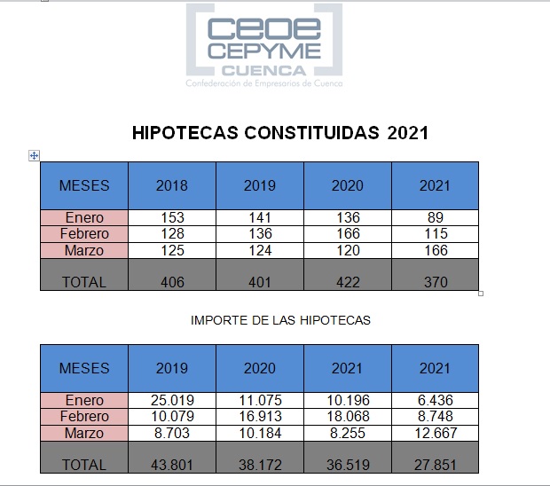 La Confederación de Empresarios de Cuenca señala que los cambios en las hipotecas han crecido en un 308% de enero a marzo de 2021 sobre el mismo periodo de 2020, situándose en 151 cambios en este trimestre sobre las 37, del año anterior, 114 más.