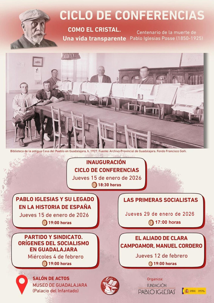 El ciclo de conferencias “Como el cristal. Una vida transparente”, que organiza la Fundación Pablo Iglesias con la colaboración de PSOE Guadalajara, se reanuda mañana jueves día 29 de enero con la cita que estaba prevista para el pasado día 22, pero que fue suspendida debido al luto decretado por el trágico accidente ferroviario ocurrido en la localidad cordobesa de Adamuz.