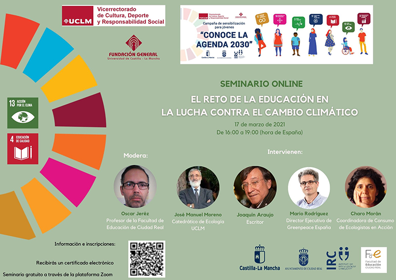 La Fundación General de la Universidad de Castilla-La Mancha (UCLM) celebrará el próximo miércoles, 17 de marzo, el segundo seminario http://fundaciongeneraluclm.es/conoce-la-agenda-2030/#pre-jornada2 de su campaña de sensibilización para jóvenes Conoce la Agenda 2030, una iniciativa que se centrará en el reto de la educación en la lucha contra el cambio climático y en la que colaborará activamente la Facultad de Educación de Ciudad Real.
