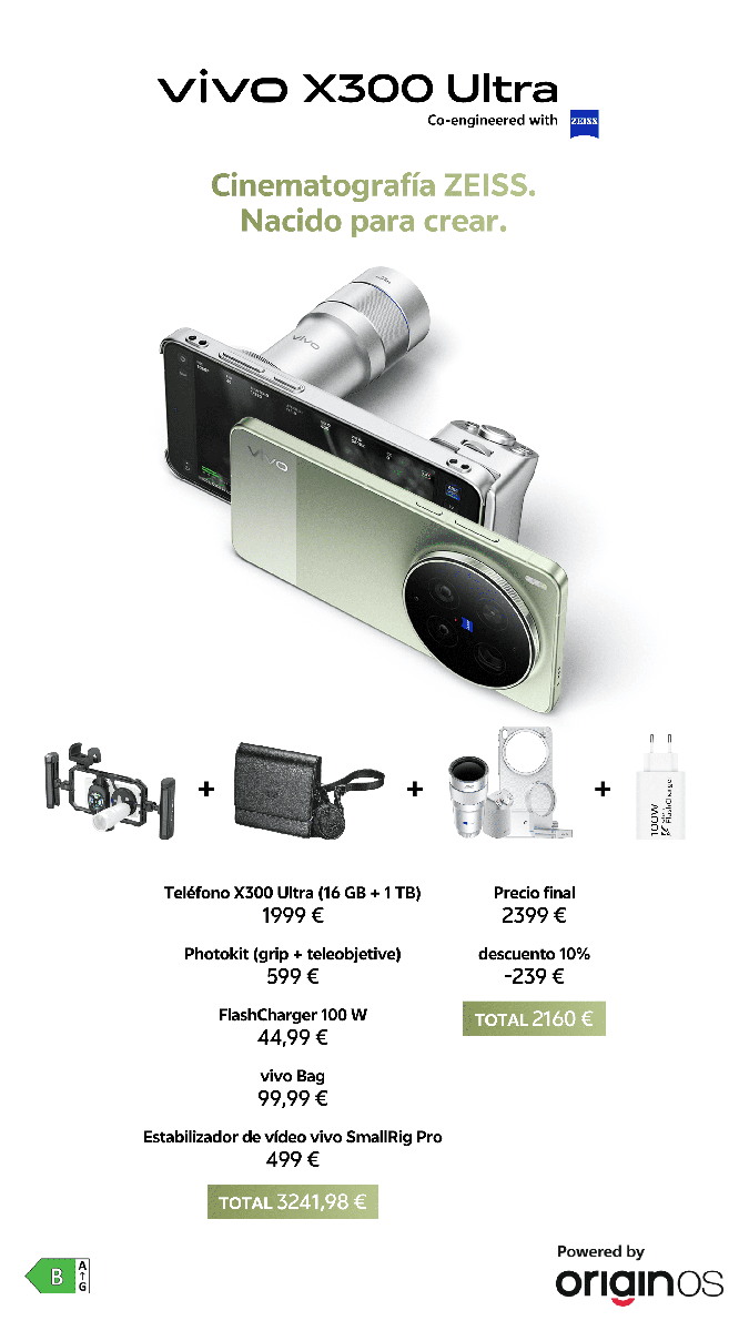 Por su parte, el vivo X300 FE aterriza en el mercado con un precio base de 999 euros por el terminal. Los usuarios disponen además de una opción tipo bundle por 1.099 euros, que suma al paquete el cargador rápido y un teleobjetivo adicional. Para este modelo, la promoción recompensa a quienes se suscriban al boletín antes del 29 de abril con un reloj inteligente vivo Watch GT2 de regalo, cuyo valor asciende a 129 euros.