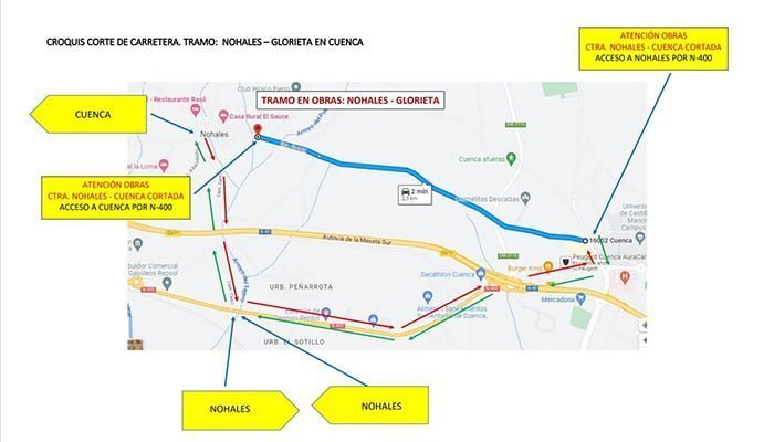 Los trabajos de pintado de marcas viales y colocación de barrera doble onda en la carretera entre Cuenca capital y Nohales que está ejecutando la Diputación Provincial de Cuenca, y que están dentro de la reparación y adecuación de 2,4 kilómetros, implican el corte de esta vía al tráfico mañana jueves 31 de agosto.