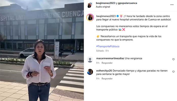 La presidenta del Grupo Municipal Popular, Bea Jiménez, ha podido comprobar en primera persona cuánto tardaría un conquense en llegar desde el centro de la ciudad al nuevo hospital. Una hora exacta ha sido el tiempo en recorrer la distancia, teniendo en cuenta que ha tenido que hacer un transbordo en el intercambiador. Si ese trayecto se hubiera hecho en vehículo privado el tiempo estimado hubieran sido de 10 minutos. Por lo tanto, con este nuevo sistema de líneas de autobuses, no se reduce la utilización del vehículo privado porque no es operativo ni funcional coger el autobús.