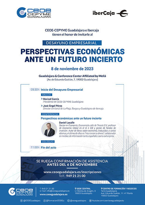 Bajo el título “Perspectivas económicas ante un futuro incierto”, el prestigioso economista Daniel Lacalle, será el protagonista de un nuevo desayuno empresarial organizado por CEOE-CEPYME Guadalajara en colaboración con Ibercaja, que tendrá lugar el próximo miércoles 8 de noviembre de 9:30 a 11:00 horas en el hotel Guadalajara & Conference Center Affiliated by Meliá.