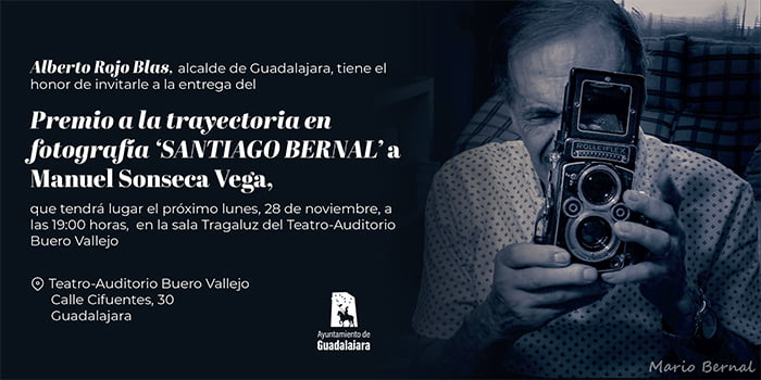 El reconocido fotógrafo Manuel Sonseca recogerá el próximo lunes el Premio a la Trayectoria en Fotografía ‘Santiago Bernal’, en su primera edición, convocado por el Ayuntamiento de Guadalajara con una dotación de 6.000 euros.