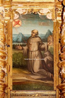 Según su biógrafo, dos años antes de su muerte, San Francisco se retiró con cinco de sus hermanos al Monte Alvernia para celebrar la Asunción de la Virgen y preparar la fiesta de San Miguel Arcángel. Fue en la fiesta de la Exaltación de la Santa Cruz cuando San Francisco arrodillado en su celda y estando rezando con los brazos abiertos, al amanecer, se le apareció Cristo Crucificado en la figura de un serafín de seis alas. Después de conversar con él desapareció dejando en el cuerpo del Santo las llagas sagradas de Cristo. De esta misma manera es como es representado en dos cuadros, de diferente autor, ambos del siglo XVI, San Francisco.