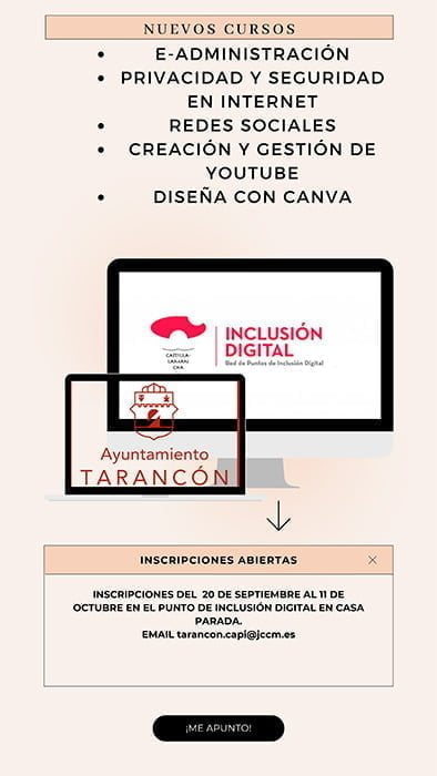 Estas actividades gratuitas, abordarán temáticas como la E-Administración, el diseño con Canva, la creación y gestión de Youtube, las redes sociales, o la privacidad y la seguridad en internet. El concejal de Nuevas Tecnologías, Raúl Añover, anima a las personas adultas interesadas a enviar un correo electrónico a tarancon.capi@jccm.es o acudir en horario de 17 a 21 horas (de lunes a viernes) al Punto de Inclusión Digital Tarancón, que es uno de los más de 780 que forman parte de la Red de Puntos de Inclusión Digital de Castilla-La Mancha.
