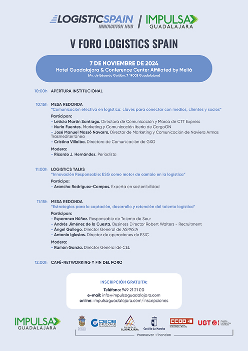 El 7 de noviembre, a las 10.00 horas, el hotel Meliá de la ciudad acogerá la quinta edición del Foro ‘Logistics Spain’. Un foro enmarcado dentro de la estrategia ‘Impulsa Guadalajara’, un proyecto promovido por CEOE-CEPYME Guadalajara, Diputación provincial, Ayuntamiento de Guadalajara, Junta de Comunidades de Castilla-La Mancha, CC.OO y UGT.