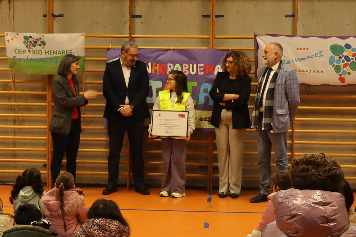 Eusebio Robles, acompañado por la delegada provincial de Hacienda, Administraciones Públicas y Transformación Digital en Guadalajara, Sonsoles Rico; y el delegado provincial de Educación, Cultura y Deportes, Ángel Francisco Fernández-Montes; ha sido el encargado de entregar el galardón a la alumna, mientras destacaba la originalidad del dibujo, un gran corazón en el que encajan todas las piezas como símbolo de la ayuda de todos ante una emergencia e invitaba a todos los estudiantes a participar en este concurso.