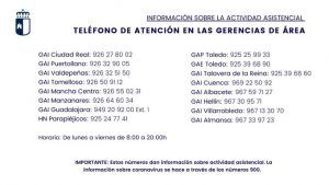 El Servicio de Salud de Castilla-La Mancha, a través de las diferentes Gerencias de Área, ha habilitado teléfonos de información para resolver las dudas de los pacientes respecto a las citas programadas, tanto en los centros de salud y consultorios locales como en los hospitales, que se hayan visto alteradas por la situación derivada del coronavirus.