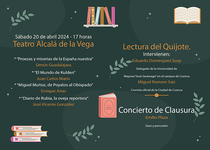 El programa se inicia a las cinco de la tarde en el recinto del teatro municipal de Alcalá de la Vega con la presentación de los últimos libros de autores de la comarca como Simón Guadalajara, Juan Carlos Marín, Enrique Arias y José Vicente González. Cada uno de ellos describirá el contenido de sus obras para conocimiento de los habitantes de Alcalá de la Vega y de los pueblos invitados a participar como Boniches, Fuentelespino de Moya, Salinas del Manzano, Campillos Paravientos, Zafrilla y Cañete. A continuación el historiador y cronista oficial de la Ciudad de Cuenca, Miguel Romero Sáiz, y el ingeniero industrial y delegado en el campus de Cuenca de la Universidad de Mayores José Saramago, Eduardo Dominguez Suay, leerán algunos capítulos del Quijote de Miguel de Cervantes para reecordar la obra más universal de las letras españolas.