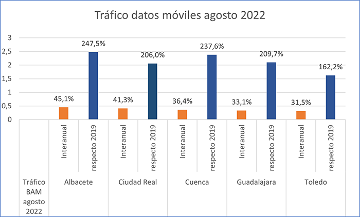 El tráfico registrado en la red móvil de Movistar en Castilla-La Mancha se ha incrementado un 36% en agosto respecto al mismo mes del año pasado (2021), dos puntos por encima del incremento medio nacional, que se sitúa en el 34%. El crecimiento de este tráfico en la región con respecto a agosto de 2019, antes de la pandemia, alcanza el 201,7%, también por encima de la media nacional que es del 150%. En julio, los datos de crecimiento de banda ancha móvil en Castilla-La Mancha fueron del 45,7% en la comparación interanual y del 208%, con respecto a 2019.