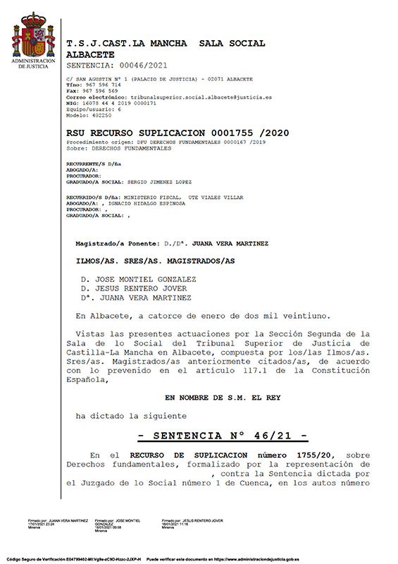 CCOO-Construcción y Servicios valora esta sentencia del TSJ CLM, que “pone fin a un largo proceso laboral y judicial iniciado hace ya más de dos años con el despido injusto, y ahora definitivamente nulo, de un trabajador, por el hecho de defender activamente los derechos laborales en el seno de su empresa y de impulsar la organización sindical de sus compañeros.”