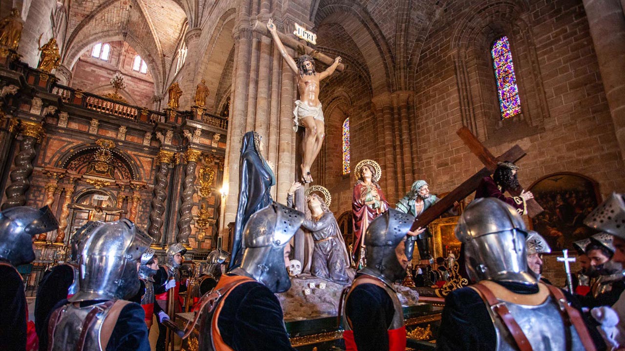 Especial relevancia histórica tiene, en este contexto, la ceremonia del Descendimiento, estrechamente vinculada al Santo Entierro y una de las expresiones más singulares que conoció la Catedral de Sigüenza. La documentación conservada acredita que ya en 1637 la Cofradía del Santo Sepulcro solicitó autorización al Cabildo catedralicio para celebrar esta representación sacra, en la que la imagen articulada de Cristo era descendida de la Cruz y depositada en la urna antes de iniciarse la procesión. Durante siglos, este acto constituyó uno de los momentos culminantes del Viernes Santo seguntino, hasta su prohibición a finales del siglo XVIII. Su recuperación en tiempos recientes ha permitido volver a poner en valor una de las ceremonias más singulares del patrimonio litúrgico y escénico de la ciudad.