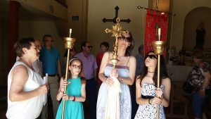 La iglesia parroquial de San Juan Bautista domina un lugar en el que están censados 25 vecinos que, hoy, han podido sacar al patrón porque había hombros suficientes para llevarlo por las calles del pueblo y no como en otros lugares que, eso, lo de la procesión, es como la parva en la era. Recuerdo, puro recuerdo de trigales y campos de cereal bien escardados en los que no tenían cabida ababoles ni arvejas que, de camino a Fuentesclaras, dan color a un paisaje agrícola que, desde el otro lado, el nuestro, resulta espectacular en un día, el de hoy, en el que hay reparto de caridad gracias a una vecina: Encarnación Torrijos.