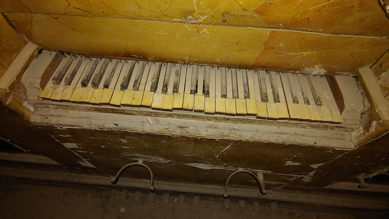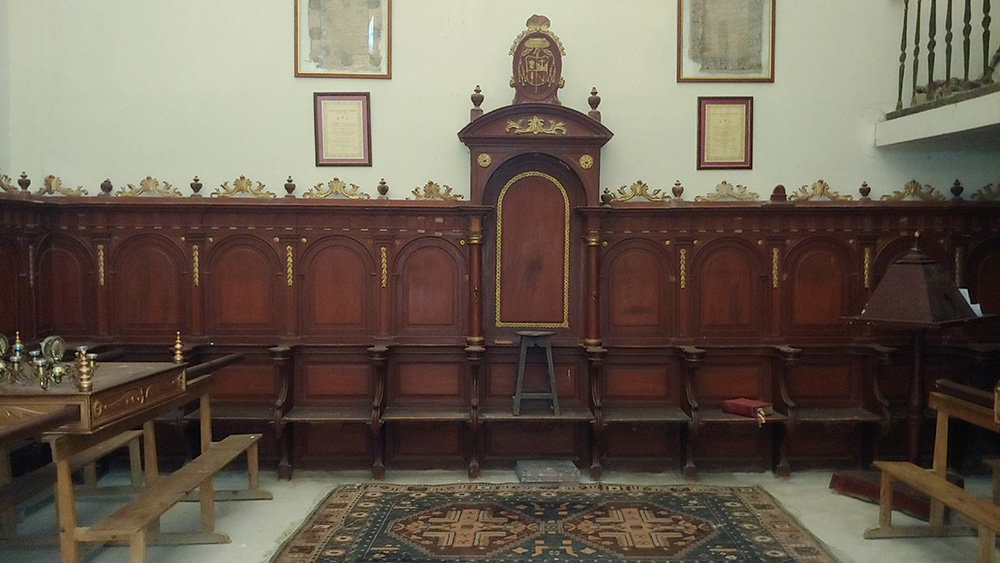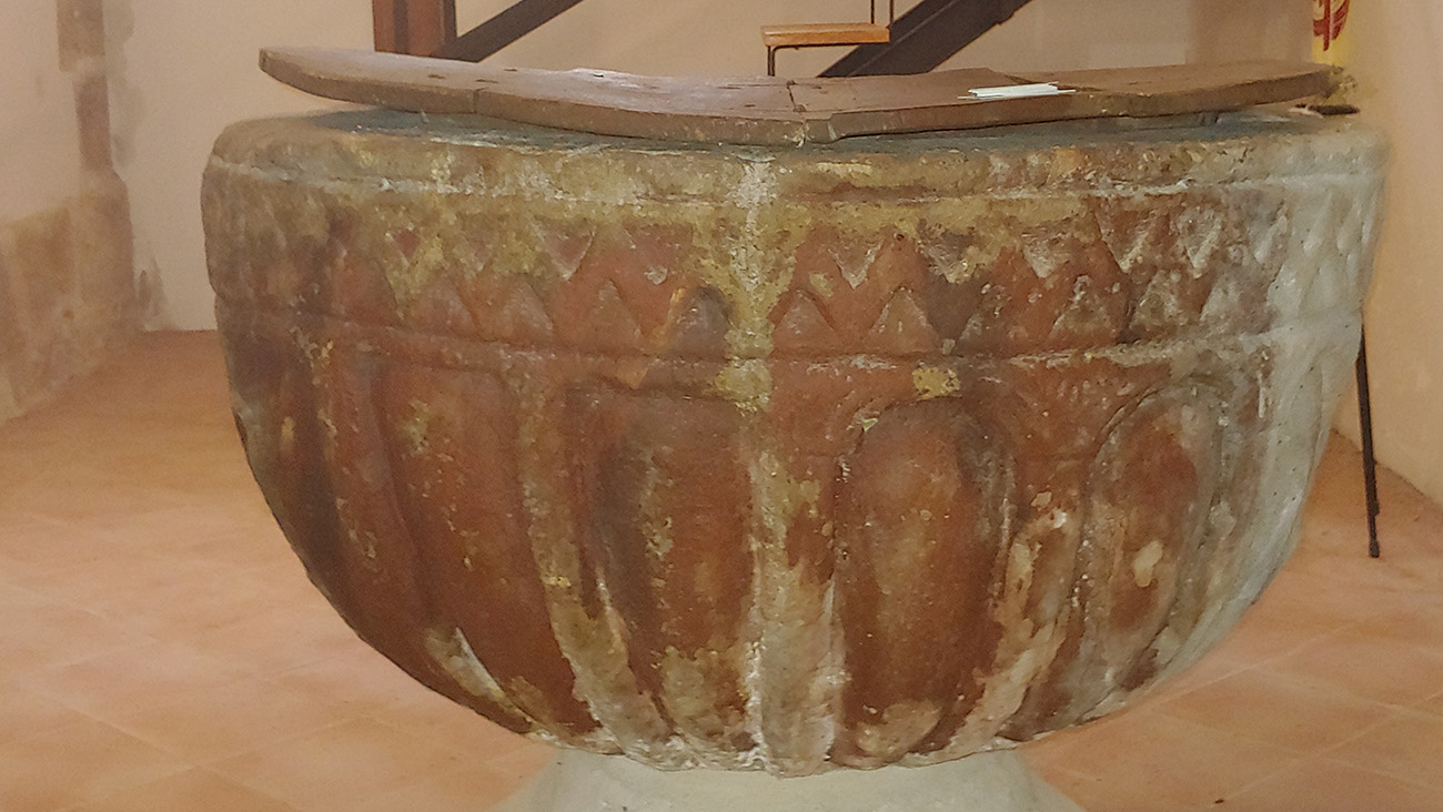 Entrando, a la izquierda, Impresiona la sillería coral con 27 sitiales de madera quedando, en el centro, la del obispo Fray Julián y, arriba, en una primera planta, el órgano con trompetería que, en su tiempo, finales del XVII, sería de los mejores de toda la provincia de Cuenca. A su lado, en una pequeña capilla, se puede contemplar la pila de agua bendita, de jaspe rojo, de aspecto románico cuyo vaso lleva una decoración de bocel sogueado en su boca. Bajo el bocel sogueado se desarrolla una cenefa con moldura en forma de dientes de sierra, y desde ella parten hacia la parte inferior del vaso una decoración gallonada enmarcada entre arcos de medio punto doblados que se apoyan en columnas que se recogen en su base muy similares a la pila bautismal de Huelves.