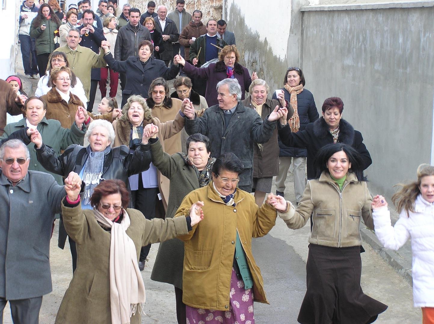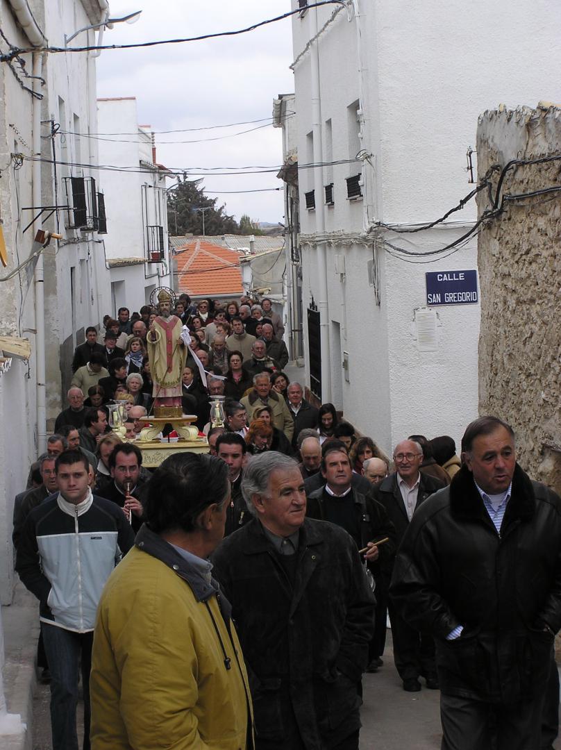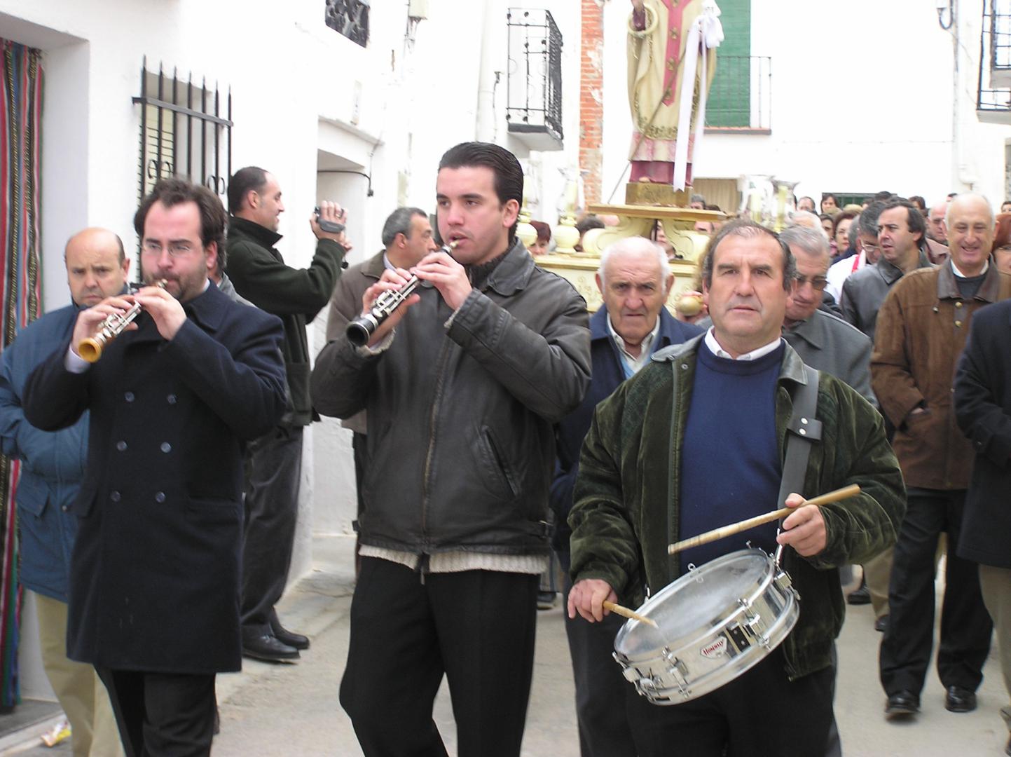 Al bajar del coche escucho los sonidos de las dulzainas por las calles cercanas. Y es que, es tiempo de diana y toque de llamada para la hora cercana de la procesión, y a ello se afanan los dulzaineros, con la compañía de los directivos de la Hermandad. A las puertas de las casas, asoman los vecinos e invitan a la comitiva a un refrigerio. Pasados unos minutos, se vuelve al callejear, «porque la hora se nos va echando encima y hay que preparar la procesión del Santo…»