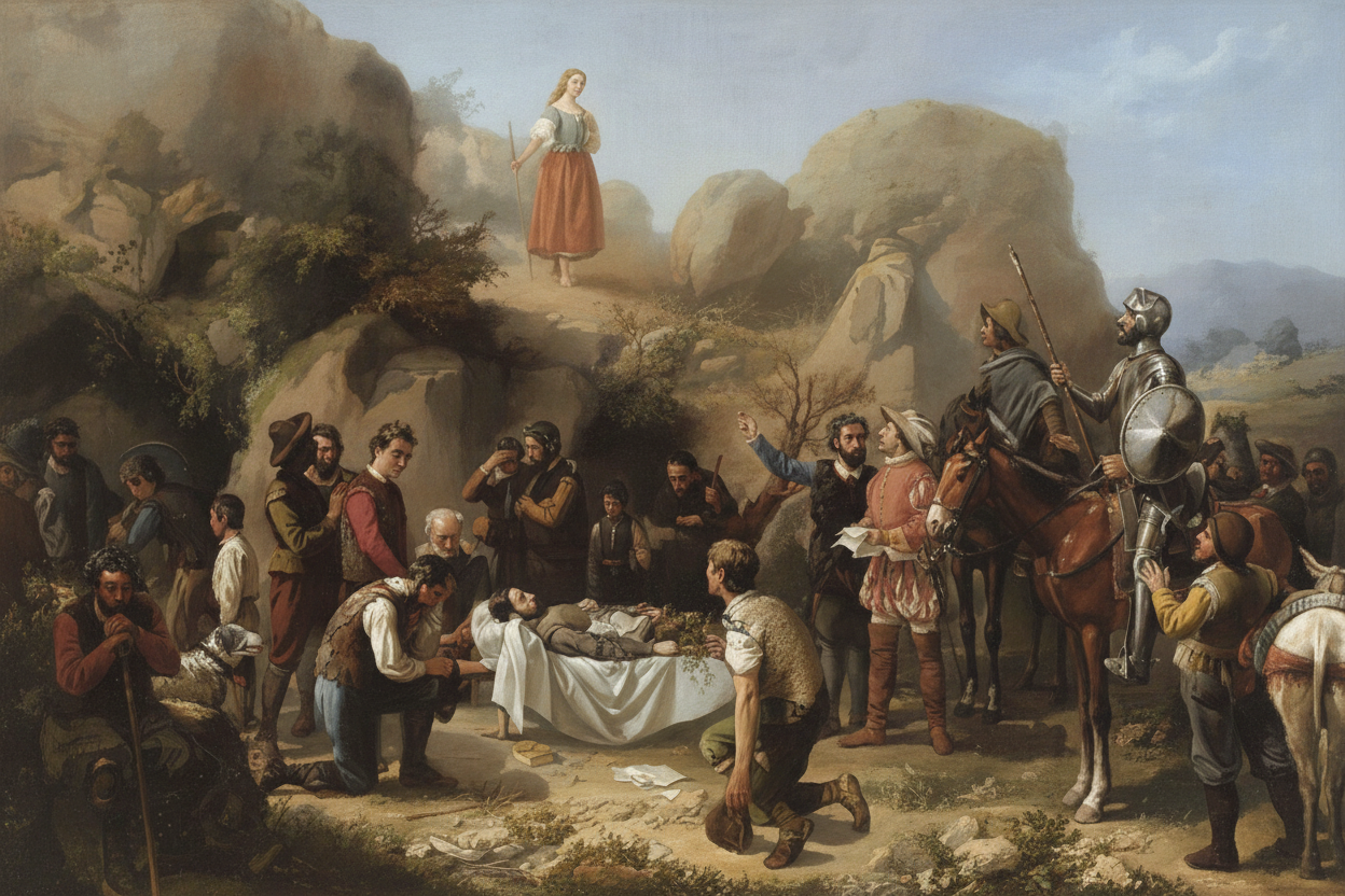 EL ENTIERRO generated image 5Y así, leyendo El Quijote, en la vida real, en ese análisis comparativo entre lo ficticio y la realidad, hicimos noche a la lumbre de unos pastores trashumantes, el recordado Herminio Carrillo cantó a Marcela, acompañándose con su rabel, Josefina Gonzalo, nuestra pastora, desgranaba vivencias en el Charco el Tamujo, el profesor López Gómez, de la Universidad Autónoma de Madrid explicaba el porqué de esos hayedos citados por Cervantes y, cómo no, hablamos de un entierro, fuera del cementerio, en el programa “En un lugar de La Mancha” que publicamos mañana, aquí, en El Liberal de Castilla